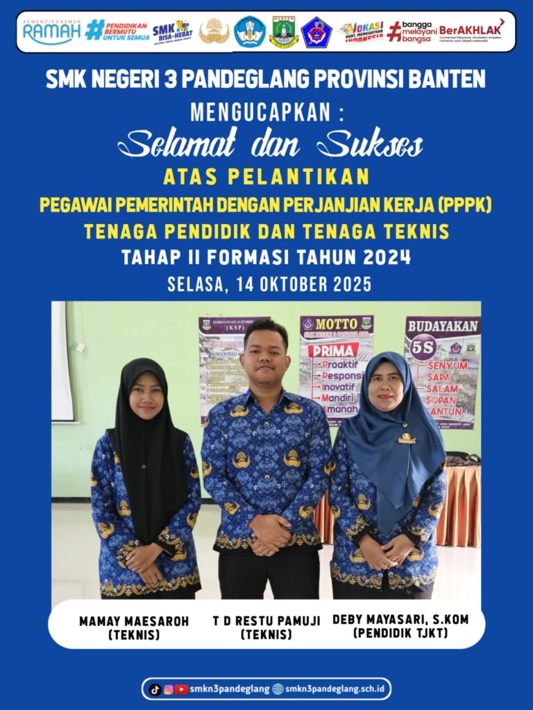 SMK Negeri 3 Pandeglang mengucapkan selamat dan sukses kepada para pegawai yang telah resmi dilantik sebagai Pegawai Pemerintah dengan Perjanjian Kerja (PPPK) Tahap II Formasi Tahun 2024.