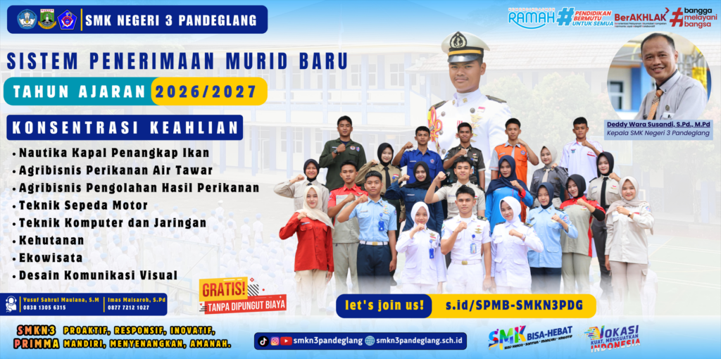 Buat kalian yang sebentar lagi lulus SMP/MTS/Sederajat dan sedang mencari sekolah untuk melanjutkan pendidikan, SMK Negeri 3 Pandeglang siap menyambut kalian menjadi bagian dari generasi hebat berikutnya.
